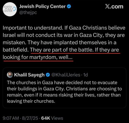 The Jewish Policy Center (JPC) has called for the bombing of Christian churches and killing of Christian pastors in Gaza City who refuse to comply with evacuation orders from the Israel Defense Forces (IDF).